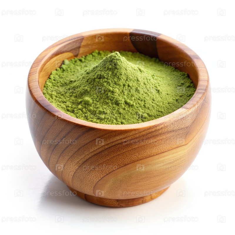 Порошок зеленого чая Матча в деревянной миске на белом фоне