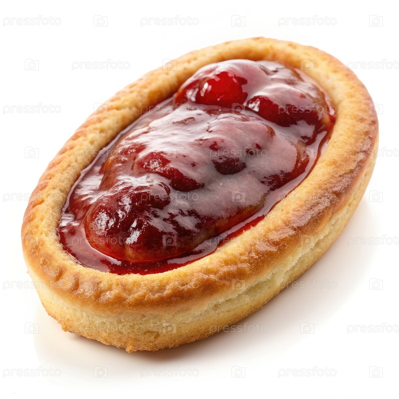 Овальная выпечка, заполненная клубничным варенем на белом фоне