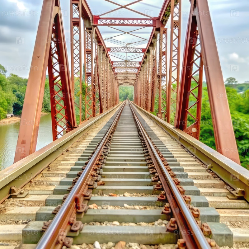 Железнодорожный мост через реку с треками, ведущими к горизонту