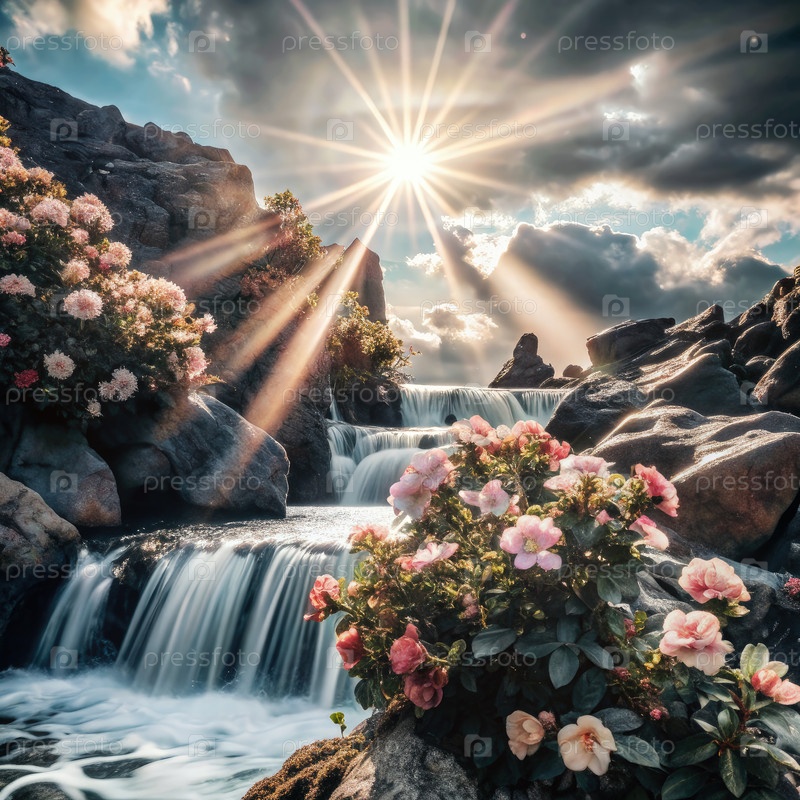 Солнечный водопад с розовыми цветами и облачным небом