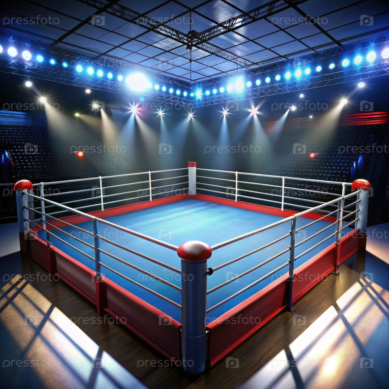 Пустое боксерское кольцо, освещенное световыми фонарями в профессиональной арене