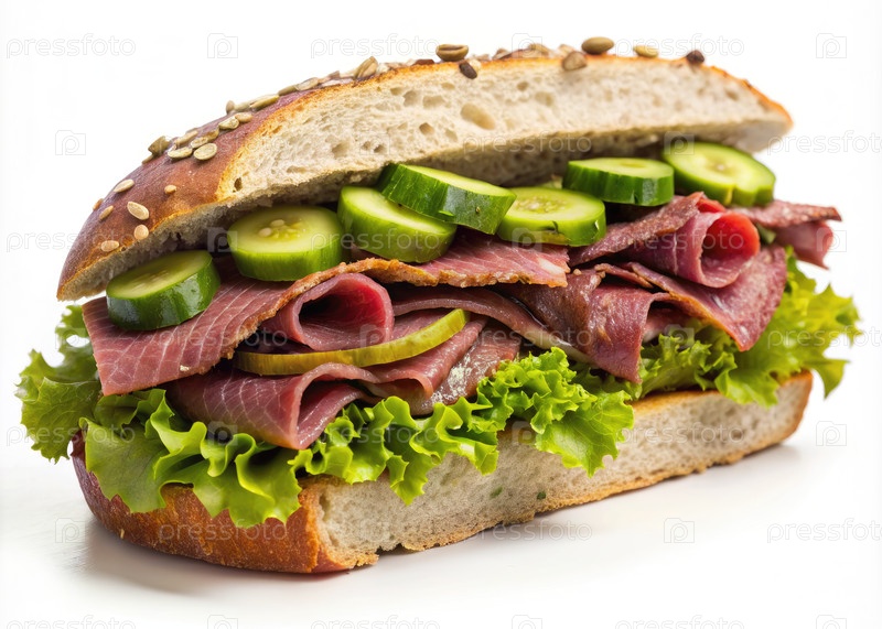 Ближайшее изображение бутерброда с говядиной и маринованными огурцами на белом фоне