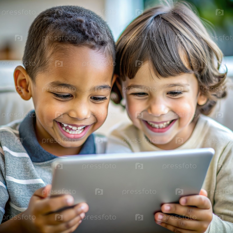 Два юных мальчика улыбаются, читая планшет вместе