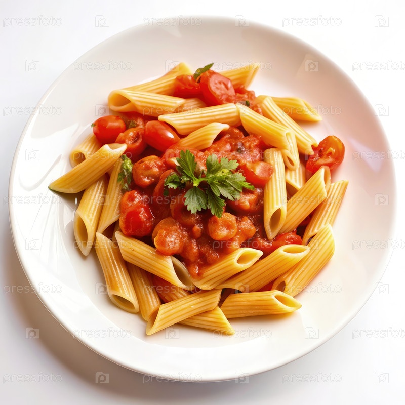 Penne Rigate Паста с томатным соусом и перцушкой на белой тарелке