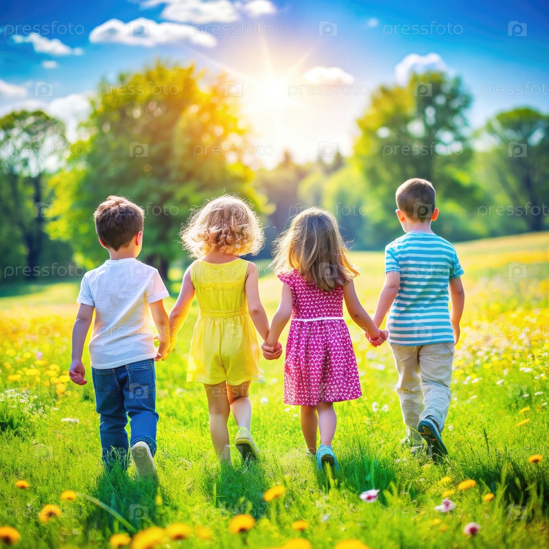 Маленькие дети ходят рука об руку по солнечной лужайке
