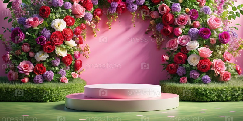 Подиум с розовой цветочной аркой. генеративный Розовая ИИ