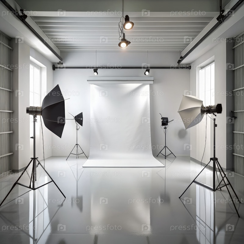 Пустая фотостудия с белым фоном и осветительным оборудованием. генеративный ИИ