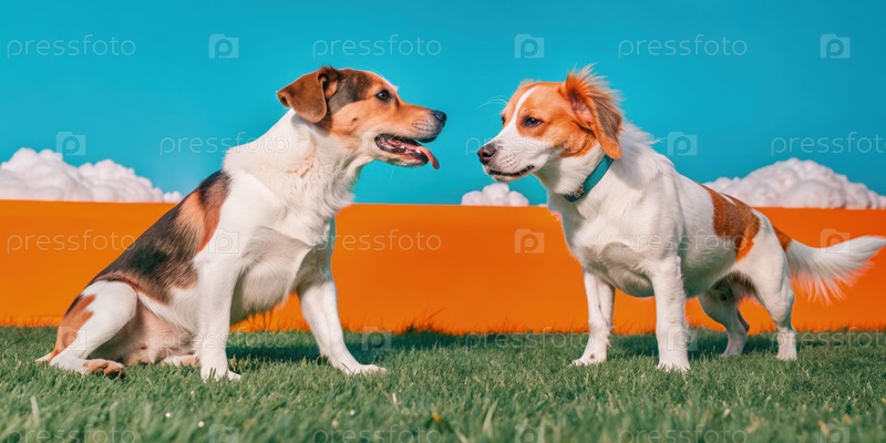 Две собаки играют на зеленой лужайке против голубого неба