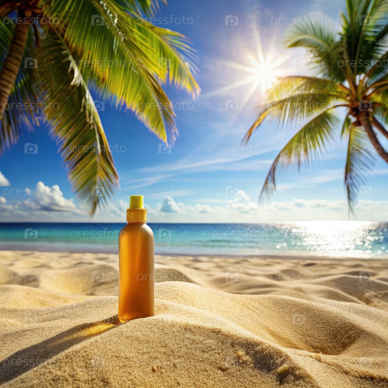 Бутылка солнцезащитного крема на Солнечном пляже под пальмовыми деревьями