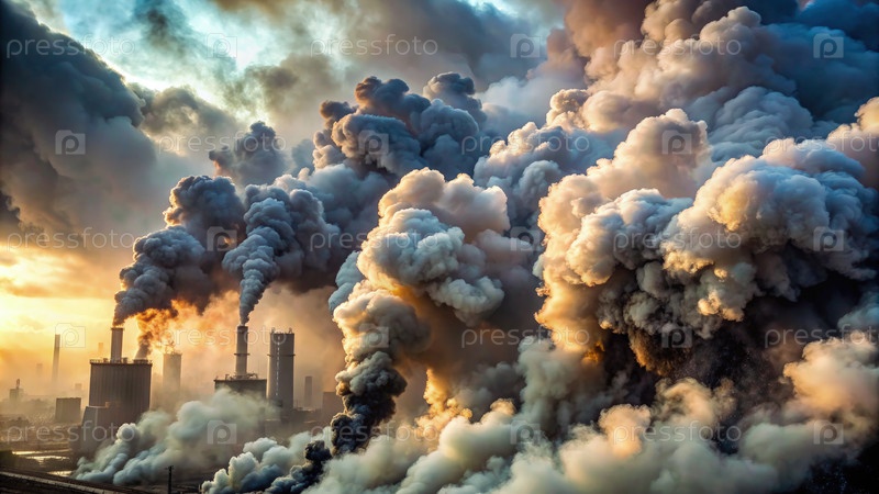 Дымные сливы заполняют небо над городской зоной на закате