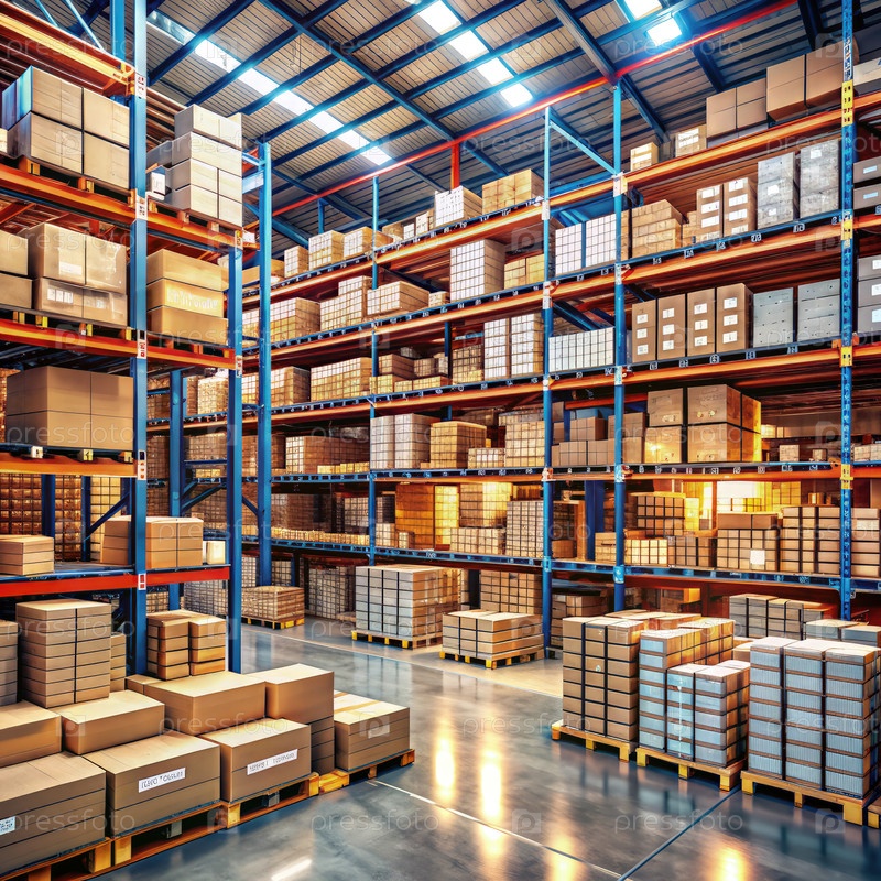 Хорошо освещенный склад с высокими полками, заполненными картонными коробками