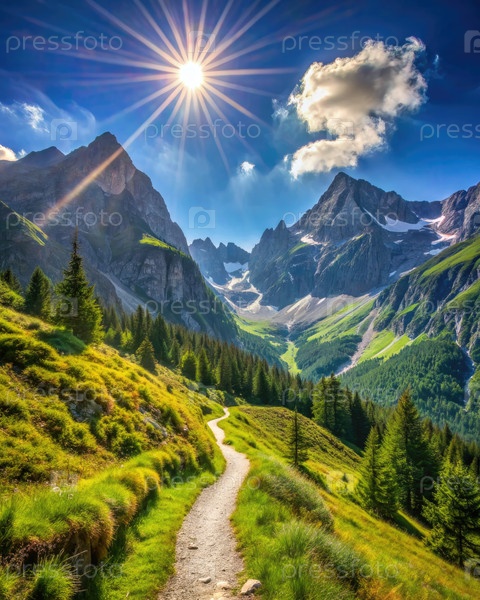 Извилистый горный путь под солнечным небом. генеративная ИИ