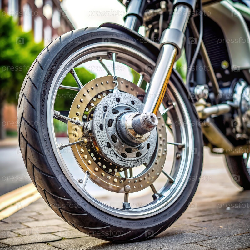 Ближайшее изображение колес мотоцикла с тормозами ABS на улице. генеративный ИИ