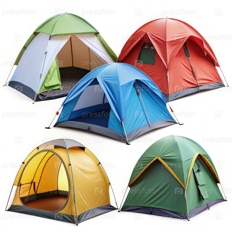 Пять красочных кемпинговых палаток, изолированных на белом фоне