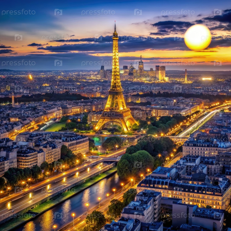 Эйфелева башня освещается на закате с полнолунием над Парижем
