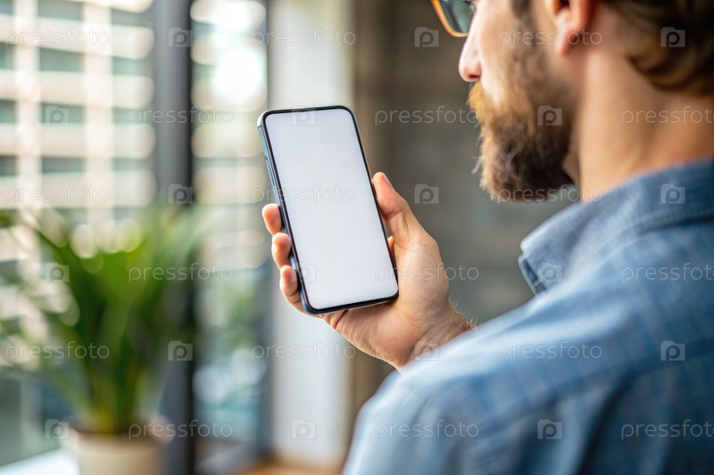 Человек, держащий смартфон с пустым экраном в помещении
