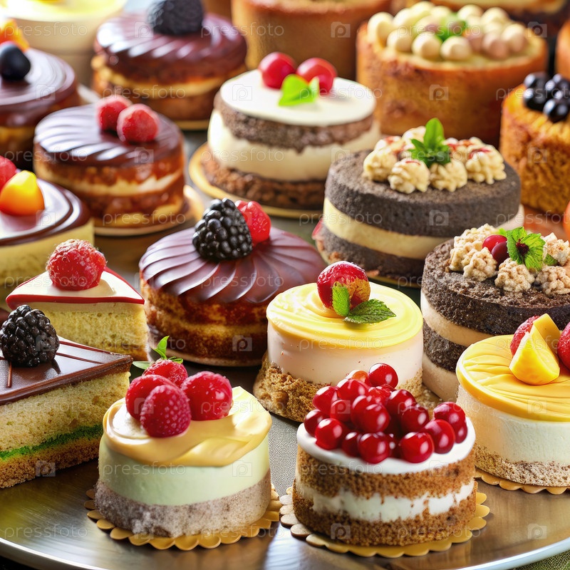 Разнообразные мини-кеки со свежими фруктовыми начинками на серебряной тарелке