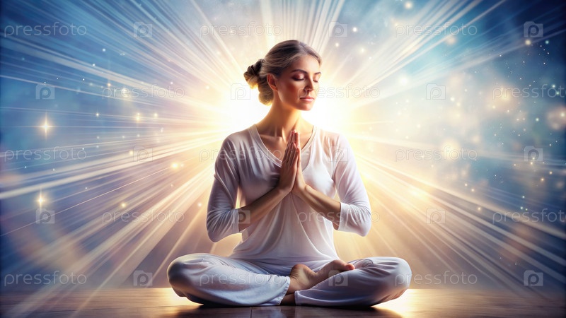 Женщина медитирует в ярком свете с закрытыми глазами