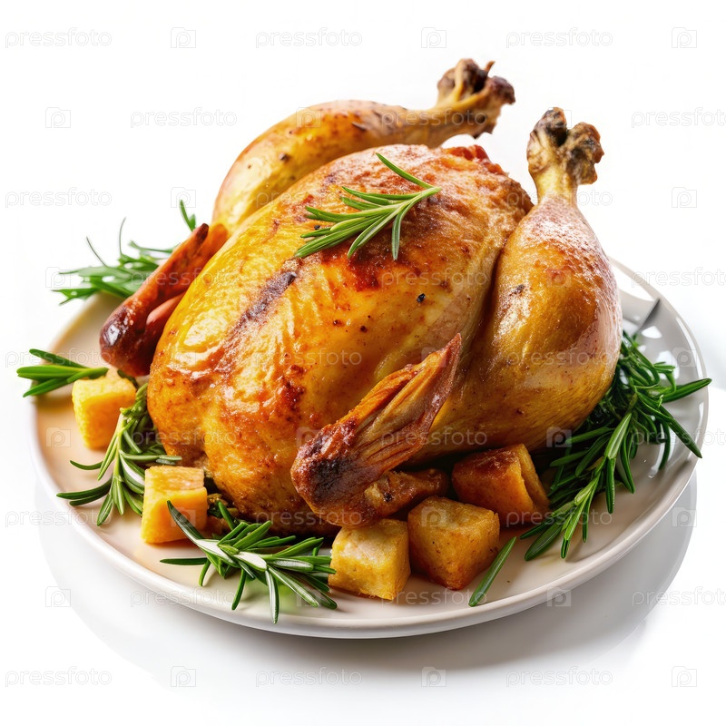 Печеная курица с розмарином и кротонами на белой тарелке. генеративный ИИ