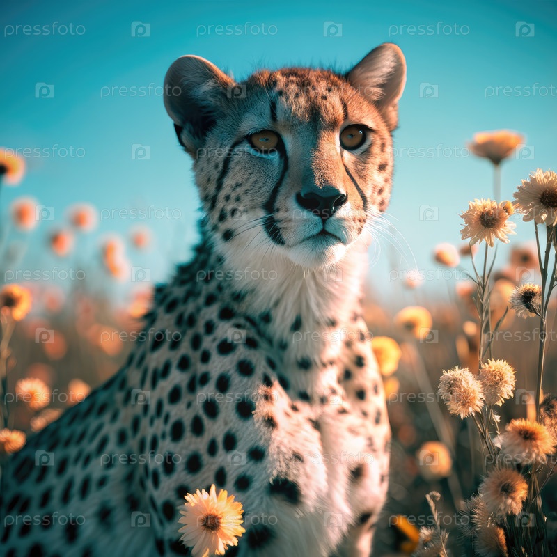 Портрет гепарда среди желтых диких цветов на африканской саване