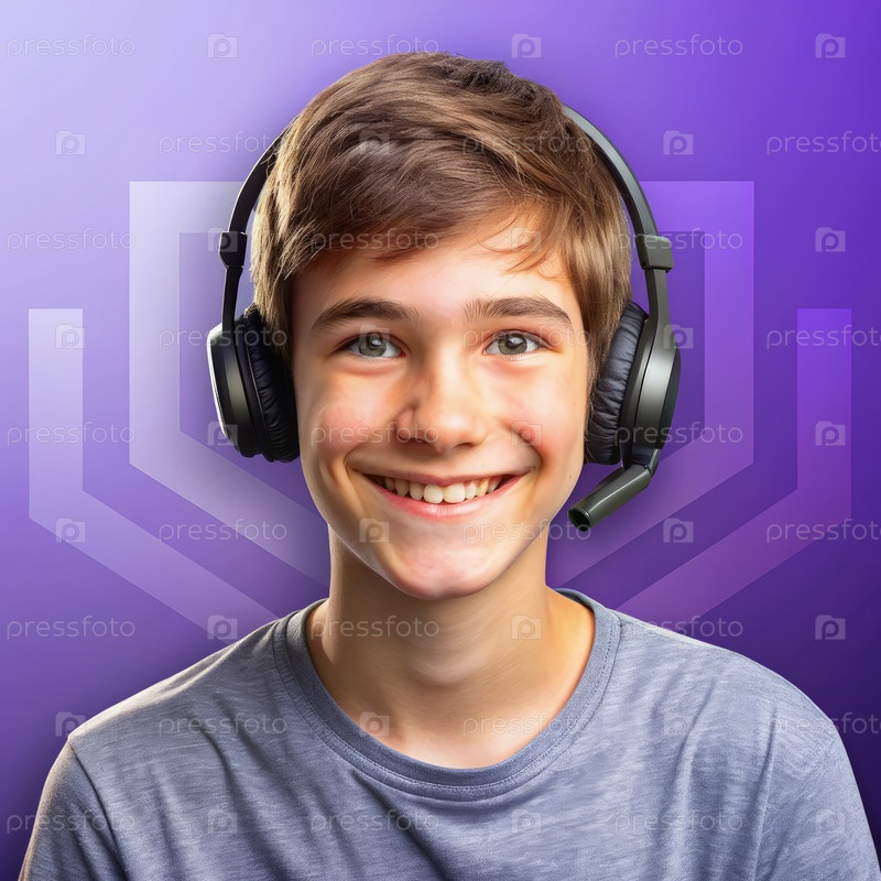 Улыбающийся подросток, носящий наушники на фоне фиолетового фона