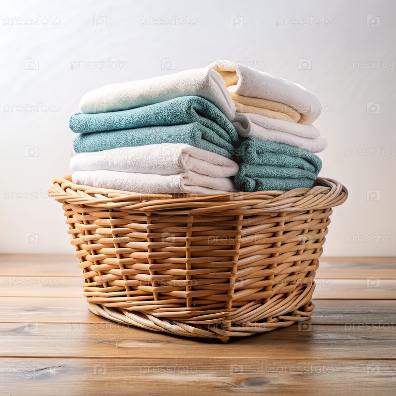 Белые и зеленые полотенца в корзине из смолы на деревянном столе. генеративный чистый ИИ