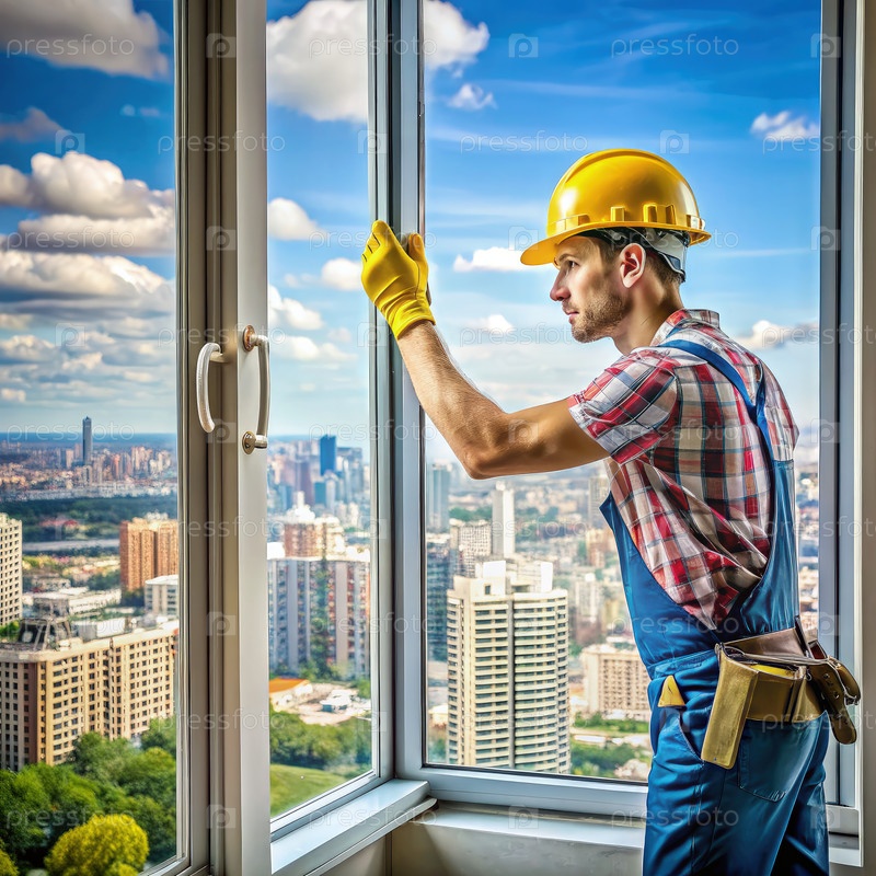 Строительный работник устанавливает окно в здании города. генеративный ИИ