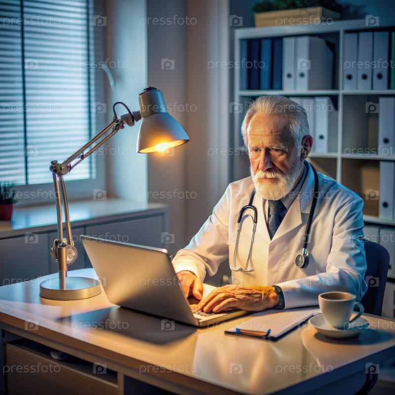 Пожилой врач, работающий допоздна за столом в больнице