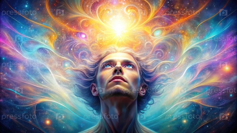 Человек с светящимися глазами смотрит вверх на космический дисплей