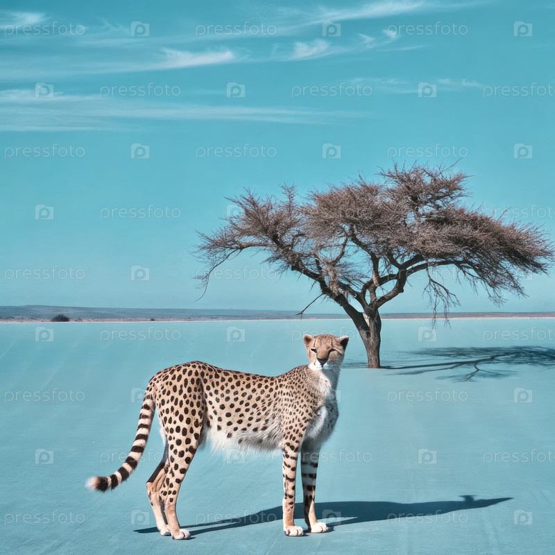 Гепард стоит в голубом пейзаже с одним деревом