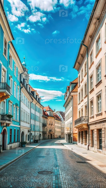 Пустая европейская улица с голубым небом в солнечный день