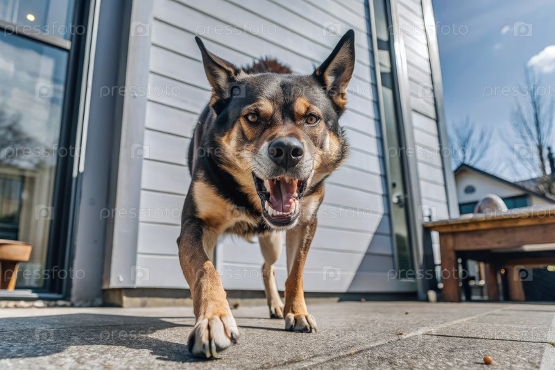 Черная и коричневая собака лает и рычит, преследуя кого-то на заднем дворе