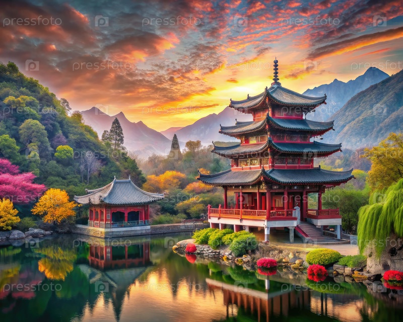 Спокойная пагода отражается на тихом озере при закате солнца