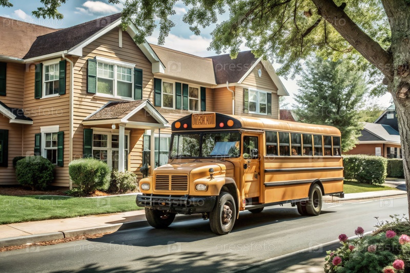 Желтый школьный автобус, проезжающий мимо пригородных домов в солнечный день