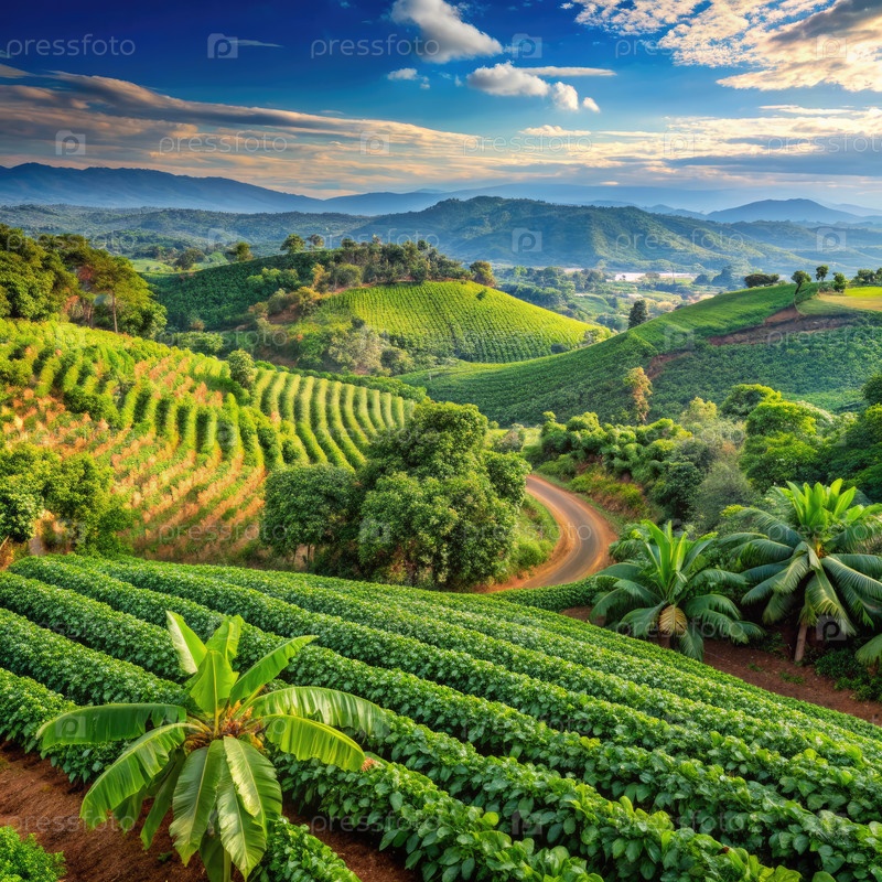Роскошный зеленый кофе и банановые плантации в Роллинг-Хиллз под голубым небом