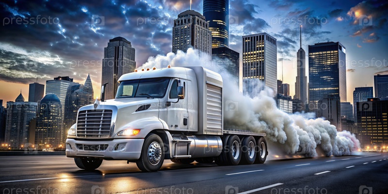 Белый полугрузовик вращает шины в городской обстановке на закате