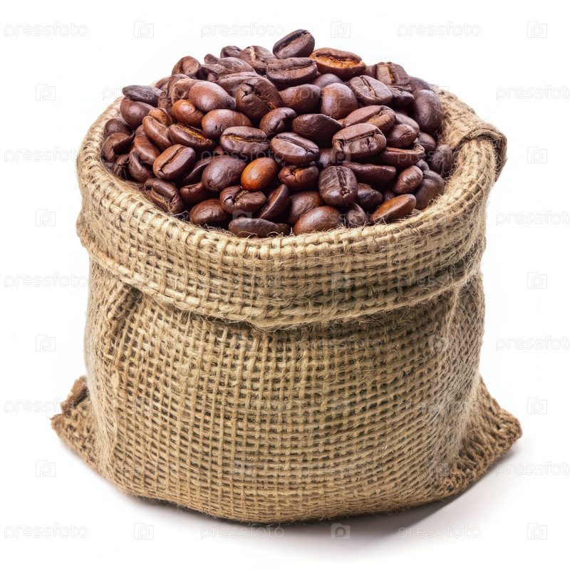 Жареные кофейные бобы в мешке из лопатки на белом фоне