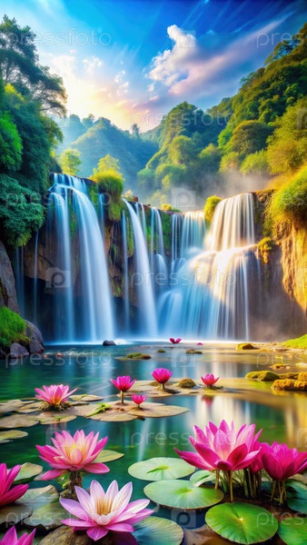 Спокойный водопад с розовыми водяными лилиями в пышной зеленой долине