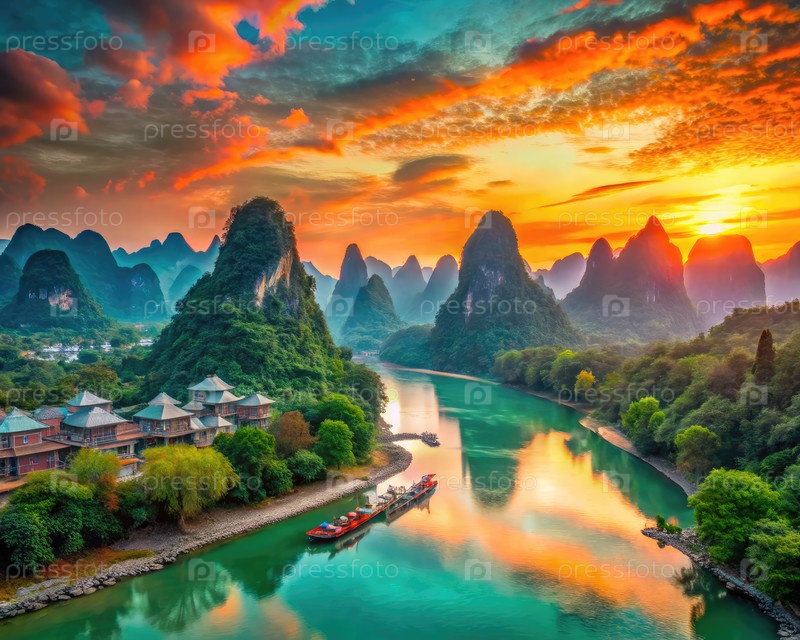 Потрясающий вид на закат солнца над пышными карстовыми горами и витящейся рекой в Гвилине, Китай