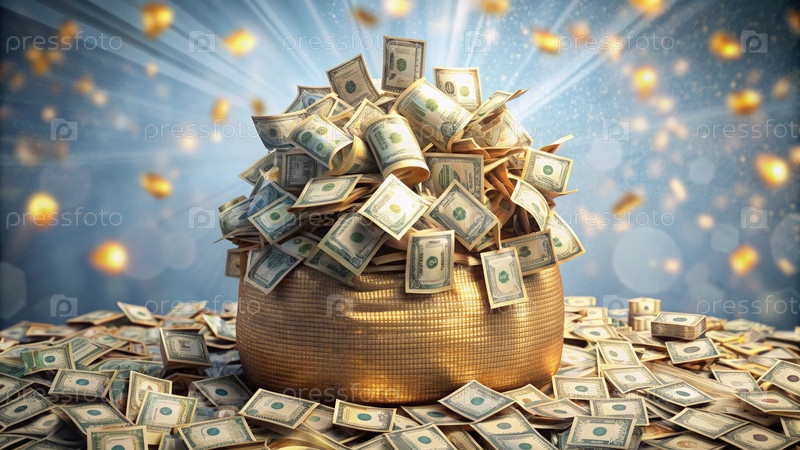 Переполненный золотой мешок, заполненный долларовыми купюрами