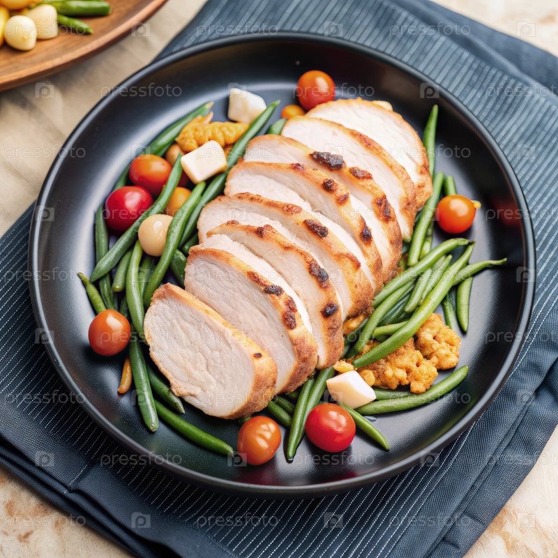 Нарезка жареной индейки с зелеными бобами и вишневыми помидорами на черной тарелке