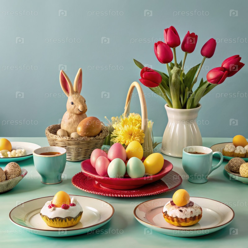 Красочное пасхальное столовое убранство с окрашенными яйцами, тюльпанами и фигурой кролика