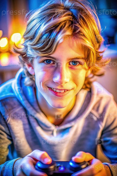 Молодой мальчик сосредоточился на видеоигре. играть дома