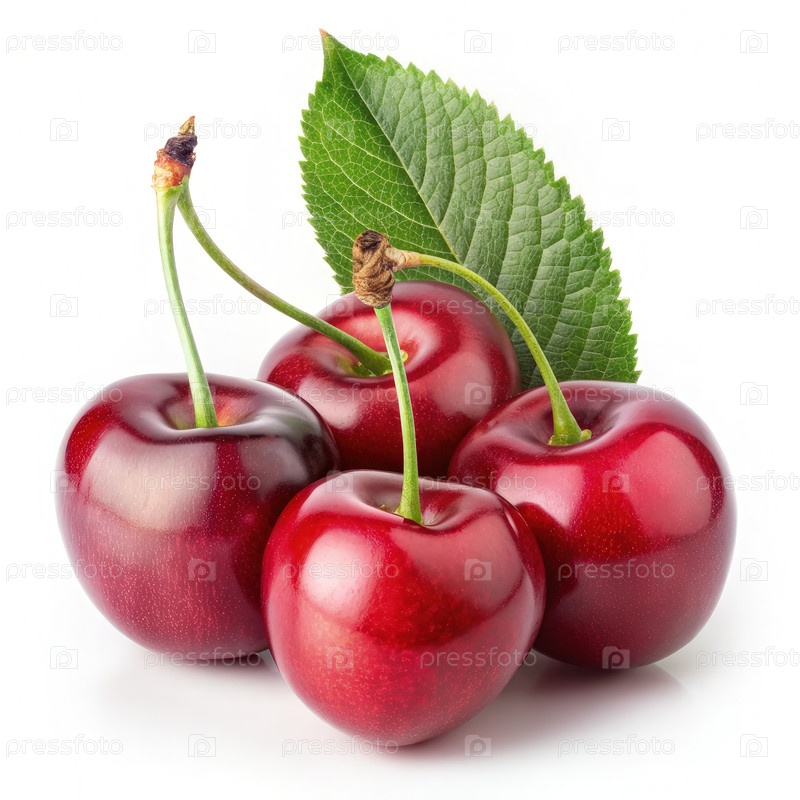 Четыре зрелых вишни с одним зеленым листьем на белом фоне