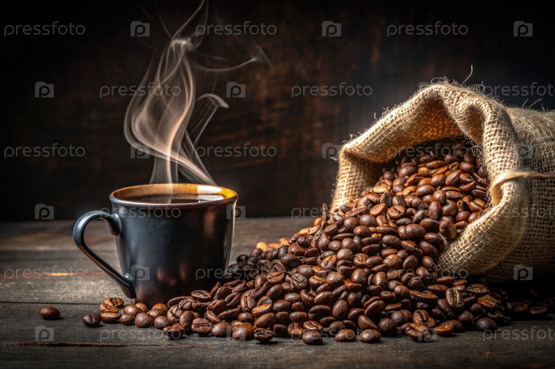 Чашка кофе с испаряющимся паром и разбросанными кофейными зернами на деревянном столе
