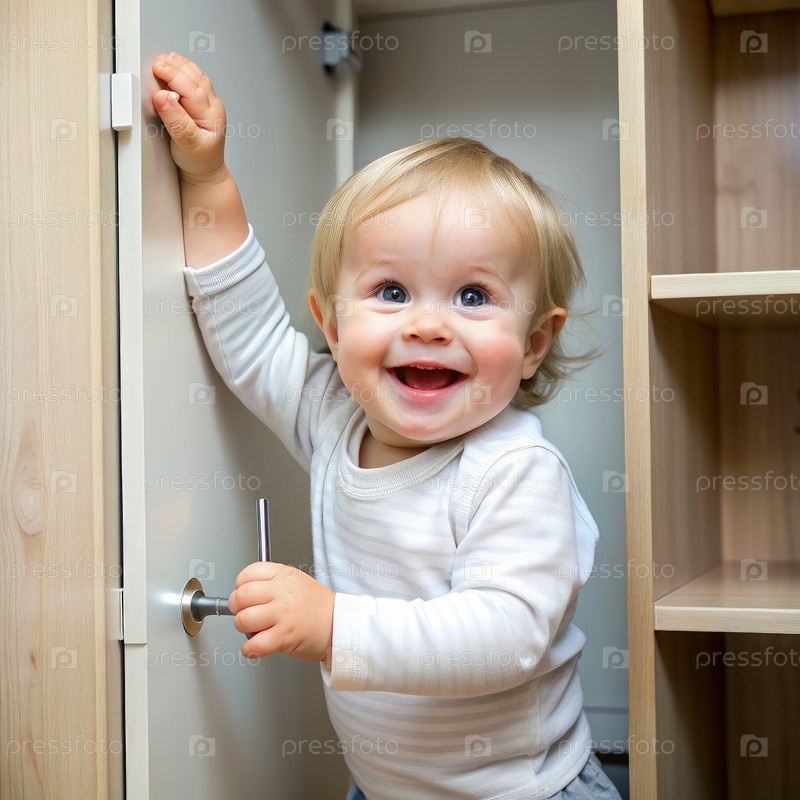 Счастливый малыш открывает дверь шкафа