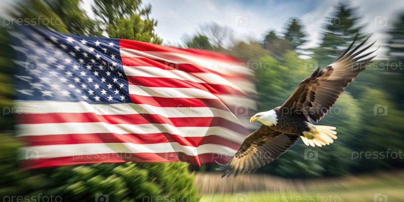 Белый орел, поднимающийся мимо американского флага в зеленом лесу