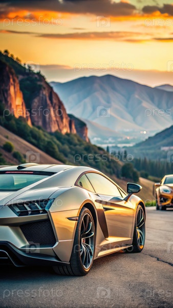 Серебряный спортивный автомобиль, припаркованный на горной дороге в закате солнца