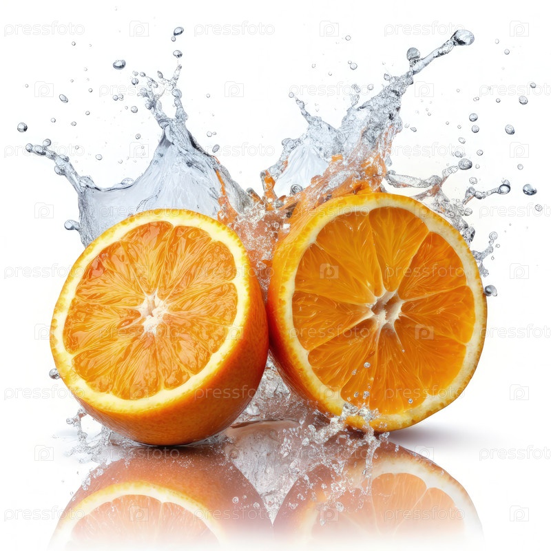Два наполовину оранжевых апельсина брызгут водой на белом фоне