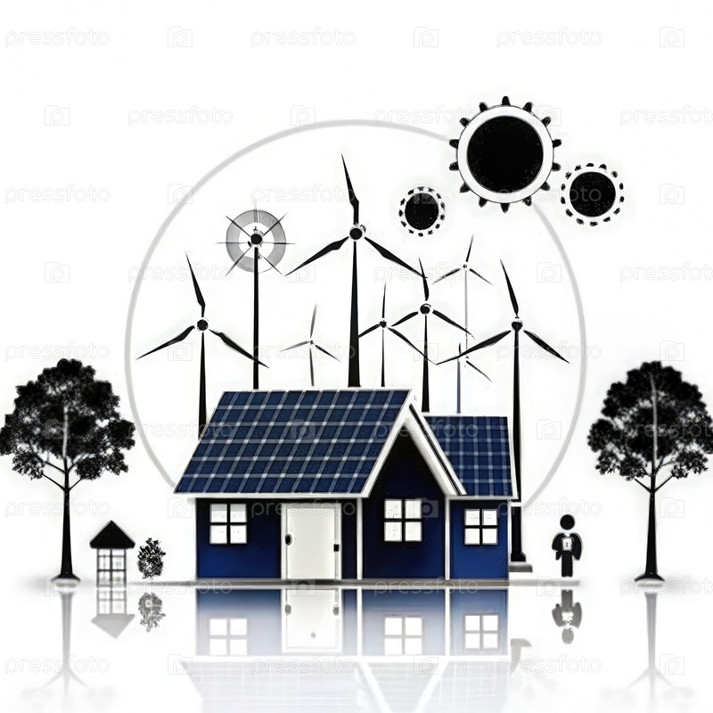Голубой дом с солнечными батареями и ветряными турбинами в зеленой среде